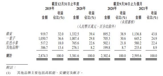 上美集团目前在多个品牌下提供品类丰富的化妆品,主要包括韩束、一叶子和红色小象三个品牌。于往绩记录期间,公司的收益主要来自该三个品牌,分别合共贡献总收益的86.6%、91.8%及91.1%。