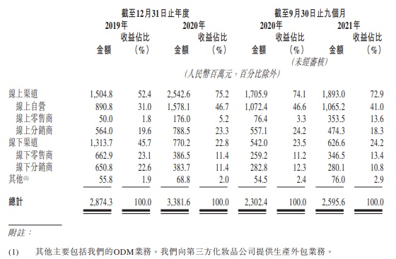 线上渠道包括线上自营、线上零售商及线上分销商。线上自营模式,公司通过第三方电商平台上的自营网店直接向终端消费者销售产品,平台主要包括天猫、抖音、京东及快手。线下渠道主要包括线下零售商及线下分销商。线下零售商主要包括大型超市及化妆品连锁店,由其再向终端客户销售产品。