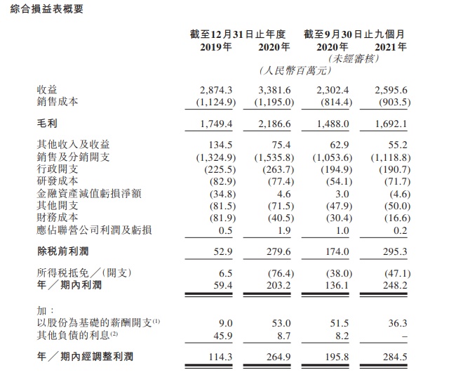2019年、2020年截至12月31日止年度及2020年、2021年截至9月30止九个月,上美集团的收益分别为人民币(下同)28.74亿元、33.82亿元及23.02亿元、25.96亿元。毛利分别为17.49亿元、21.87亿元及14.88亿元、16.92亿元。年/期内溢利分别为5940万元、2.03亿元及1.36亿元、2.48亿元。