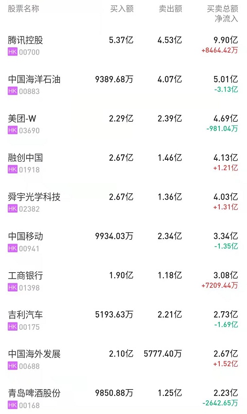 此外,舜宇光学(02382)、碧桂园服务(06098)、工商银行(01398)分别获净买入1.31亿、1亿、7209万港元。而腾讯(00700)、中海油(00883)、青岛啤酒股份(00168)分别遭净卖出6.54亿、3.13亿、2642万港元。
