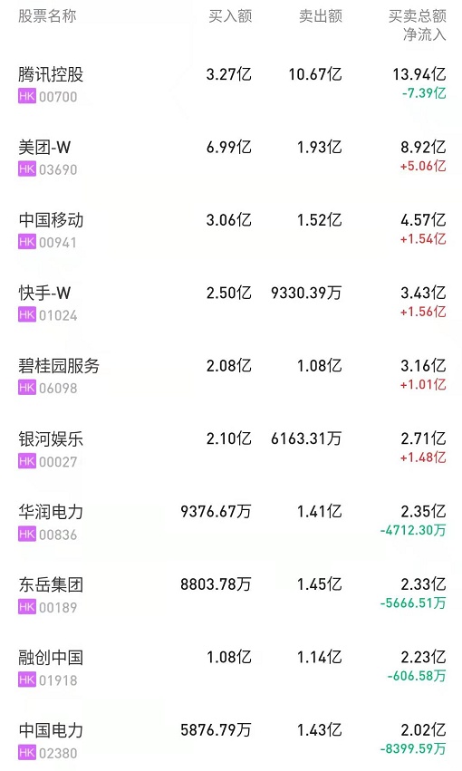 北水净买入最多的个股是美团-W(03690)、快手-W(01024)、中国海外发展(00688)。北水净卖出最多的个股是腾讯(00700)、中海油(00883)、中国电力(02380)。