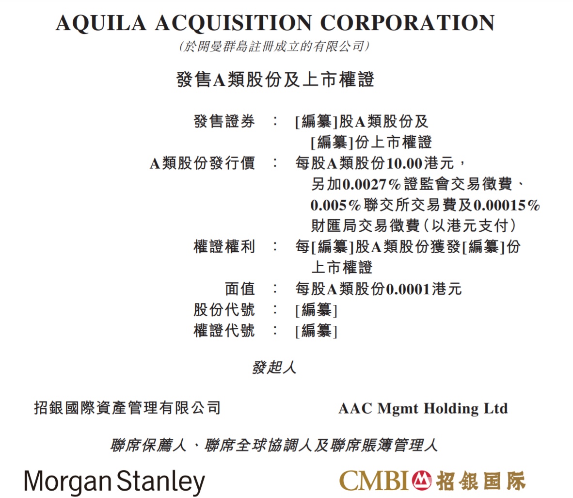 智通财经APP获悉,据港交所1月17日披露,特殊目的收购公司Aquila Acquisition Corporation向港交所主板递交上市申请,发起人为招银国际资产管理有限公司及AAC Mgmt Holding Ltd,联席保荐人、联席全球协调人及联席账簿管理人为摩根士丹利及招银国际。
