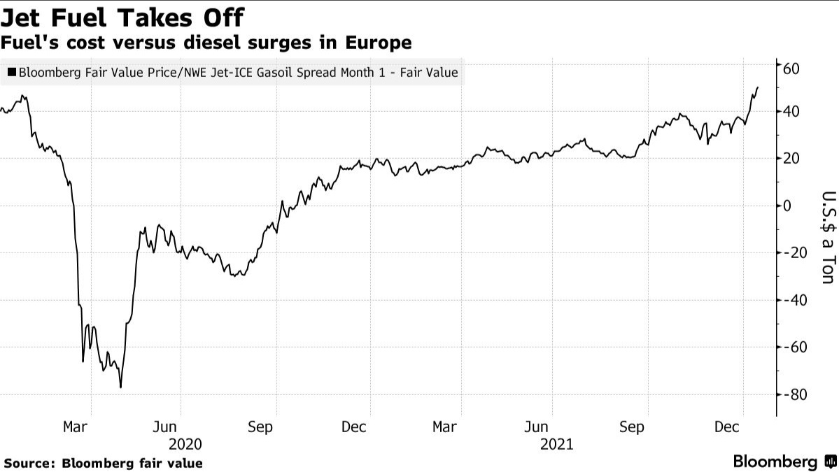 智通财经APP获悉,由于全球航空运输承受住了奥密克戎变种带来的影响,欧洲的航空燃油市场正在飙升。数据显示,作为最重要市场指标之一的航空燃料油与柴油价差飙升至2019年9月以来的最高水平。