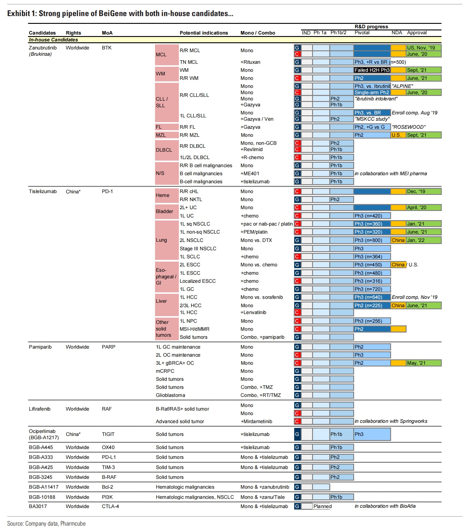研报分析指出,百济神州拥有全球最大的肿瘤研发团队之一,包括650多名科学家和2100多名内部临床开发人员。目前公司在全球超过45个地区进行临床试验,近一半的临床试验入组患者来自海外。比如其PD-1药物替雷利珠单抗已在美国递交上市申请,关键研究中约 65% 的患者是来自中国以外地区。与此同时,公司与安进(Amgen)和诺华(Novartis)等全球生物制药领军企业达成重磅合作。