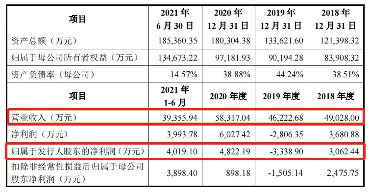 具体而言,2018年至2021年上半年,该公司实现营收分别为4.90亿元、4.62亿元、5.83亿元、3.94亿元,虽然2019年营收有所下滑,但拉长时间线来看,整体是呈现波动向上的趋势。同时,其净利润增长趋势亦是如此,期内分别实现归母净利润为3062.44万元、-3338.90万元、4822.19万元、4019.10万元。