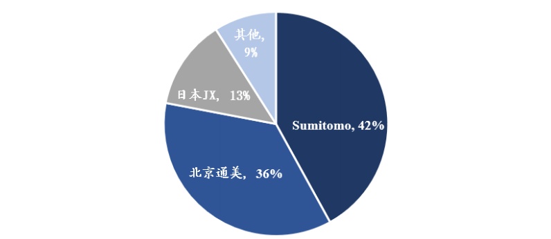 目前磷化铟衬底材料市场头部企业集中度很高,主要供应商包括Sumitomo、北京通美、日本JX等。2020年全球前三大厂商占据磷化铟衬底市场90%以上市场份额,其中Sumitomo为全球第一大厂商,占比为42%;北京通美位居第二,占比36%。