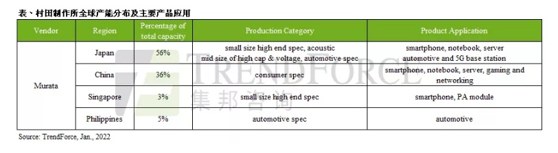 智通财经APP获悉,根据TrendForce集邦咨询统计,村田制作所(Murata)主要生产据点及产能占比分别为日本56%、中国36%、新加坡3%、菲律宾5%,近日村田制作所旗下村田福井武生厂面临员工群聚染疫,由于已事先强化生产分流管理与预先施行防疫措施,故仅部分类别产能降载或是停工,并未造成全厂停止生产。TrendForce集邦咨询表示,武生厂产能占全公司20.7%,主要生产高阶消费规格MLCC,目前部分品项减产或停工,将影响服务器、高阶智能手机等产品供货,所幸现阶段厂内仍有4~6周库存,短期应不至造成市场供货紧张。