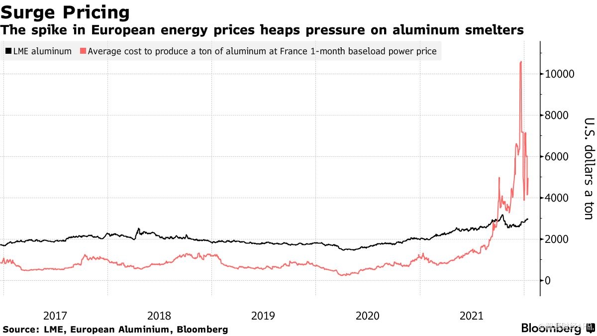 天然气和电力价格飙升对铝和锌生产商的打击尤其严重,过去几个月冶炼厂的减产和关闭引发了地区性短缺,并导致产品价格大幅上涨。欧洲金属协会在信中表示,能源危机已经导致约65万吨铝产能被削减,相当于该地区总产能的30%左右。