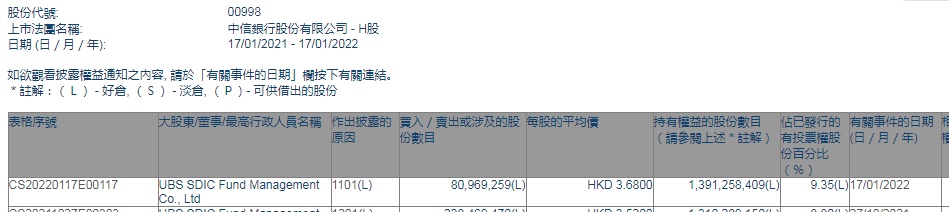 Ltd增持中信银行(00998)8096.9259万股,每股作价3.68港元,总金额约为2.98亿港元。增持后最新持股数目约为13.91亿股,最新持股比例为9.35%。