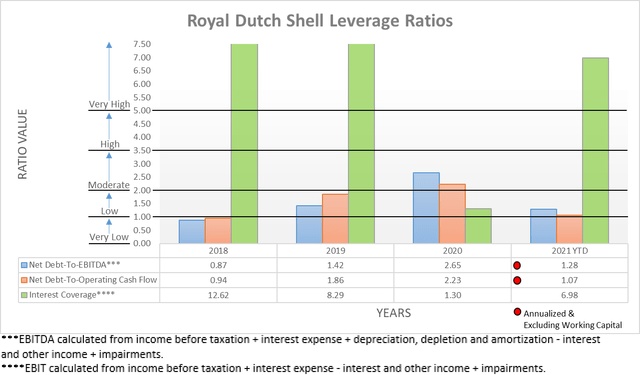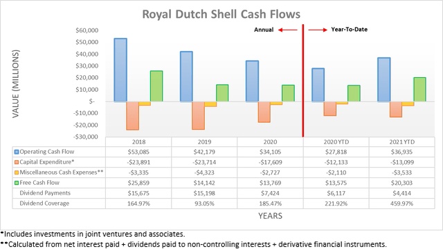 随着石油和天然气价格复苏并在2021年走强,壳牌的现金流表现同样强劲。数据显示,2021年前9个月,该公司的运营现金流达到369.35亿美元,已经超过了2020年全年的341.05亿美元。由于该公司适度的资本支出,其自由现金流也达到了高额的203.30亿美元,因此得以轻松地以459.97%的高利息覆盖率来支付44.14亿美元的股息。