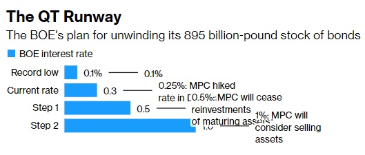 如果英国央行扣动扳机,将利率提高到0.5%,这将是自2004年以来第一次连续加息。更重要的是,这也为英国央行开启了缩表的大门,英国央行表示一旦利率达到0.5%,其将停止对到期债券进行再投资,从而开始缩减其创纪录的资产负债表规模。 这将影响到3月到期的280亿英镑(380亿美元)英国国债。