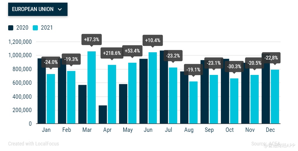 智通财经APP获悉,根据欧洲汽车制造商协会(ACEA)的数据,去年12月,欧盟乘用车注册量暴跌22.8%,至795,295辆,连续第六个月下降。 2021年欧盟的新车销量总体下降了2.4%,至970万辆,这是自上世纪90年代初以来表现最差的一年。