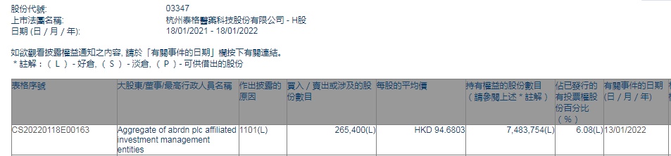 智通财经APP获悉,香港联交所最新资料显示,1月13日,Aggregate of abrdn plc affiliated investment management entities增持泰格医药(03347)26.54万股,每股作价94.6803港元,总金额约为2512.82万港元。增持后最新持股数目约为748.38万股,最新持股比例为6.08%。