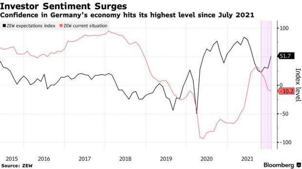 欧洲经济研究中心(ZEW)主席Achim Wambach周二在一份声明中表示:“随着新的一年的开始,德国经济前景已大幅改善。”“预计疫情的影响将在夏季初显著下降。与消费者相关的行业以及出口导向性行业的经济预期更为乐观,而这两者占德国经济的很大一部分。”