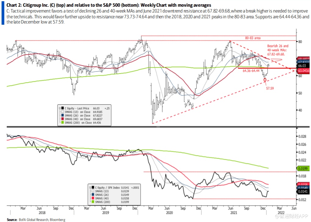 花旗集团(C.US)的技术面状况喜忧参半。 积极的一面是,股价从2020年3月至去年12月维持上行趋势,尽管股票一度下跌,但随后反弹到200周移动均线支撑位64.36-64.44之上。这种技术面的改善有利于测试26周和40周的移动均线和2021年6月下行趋势阻力位67.82-69.68,需要向上突破才能改善技术面。