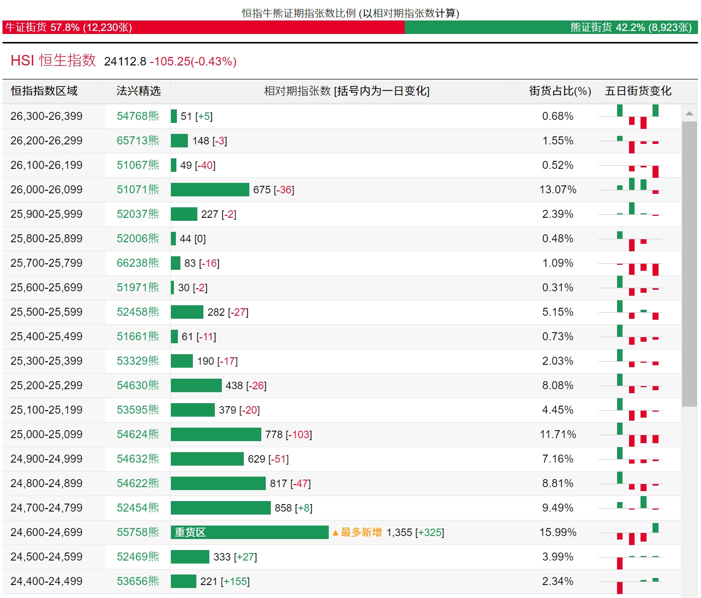 法兴恒指牛熊证街货分布图中的数据显示,熊证街货重货区和最多新增都在24600-24699区间,该区间最新熊证数量为1355张,较上一交易日增加325张。