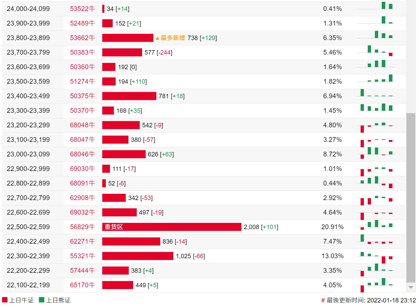 牛证街货重货区在22500-22599区间,该区间最新牛证数量为2008张,较上一交易增加101张;最多新增在23800-23899区间,该区间最新牛证数量为738张,较上一交易日增加129张。