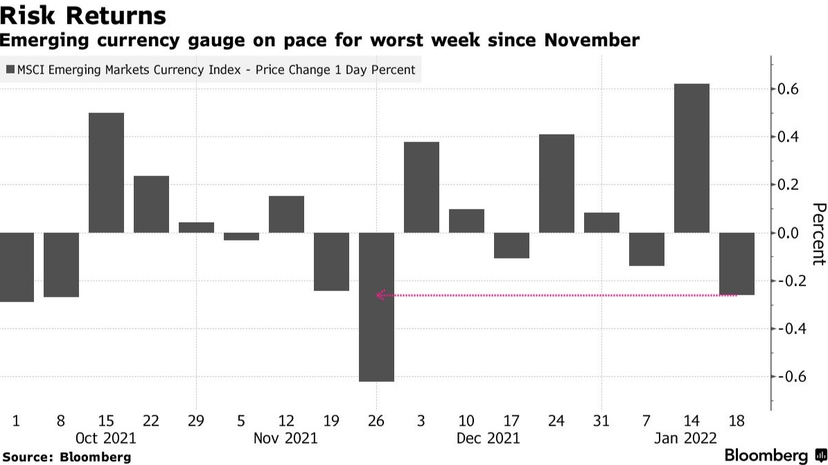 在McKenna看来,美联储收紧政策和债券收益率上升可能会抑制发展中国家货币的早期升值势头,尤其是那些国内政治形势可能恶化的国家。他表示,尽管美元兑10国集团(G10)货币今年也可能上涨,但兑新兴市场货币的升势将最为强劲。