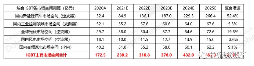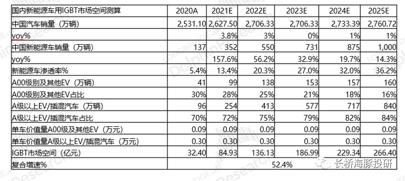 测算国内IGBT新能源车的市场空间,有望从2020年的32.4亿成长至2025年的266亿,5年复合增长率达52.4%。