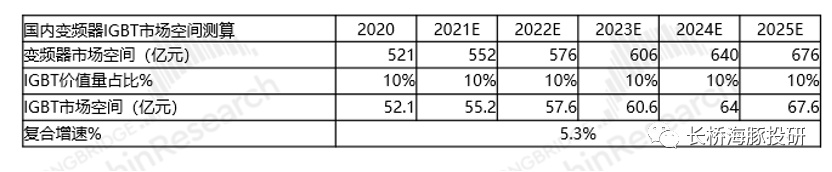 测算国内变频器市场中IGBT的市场空间,有望从2020年的52.1亿成长至2025年的67.6亿,5年复合增长率达5.3%。