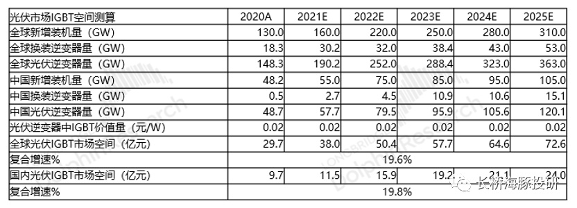 在光伏市场IGBT空间的测算,主要结合光伏的装机量来考虑。由于光伏老旧的产品有换装的需求,所以综合逆变器的需求考虑新增和换装2部分。