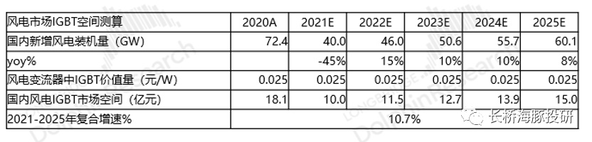 测算国内风电市场中IGBT的市场空间,有望从2021年的10亿成长至2025年的15亿,4年复合增长率达10.7%。