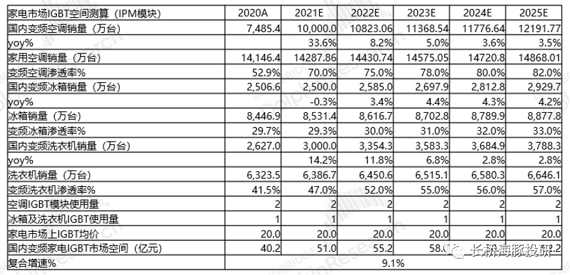 测算国内变频家电市场中IGBT的市场空间,有望从2020年的40亿成长至2025年的62.2亿,复合增长率达9.1%。