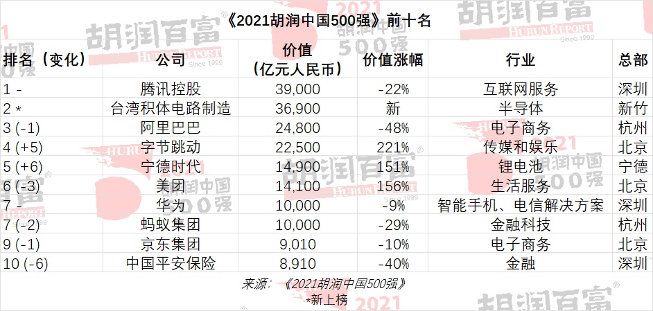 智通财经APP获悉,1月19日,胡润研究院发布《2021胡润中国500强》,列出了中国500强非国有企业,按照企业市值或估值进行排名。34家企业价值涨了一倍以上,3家企业价值涨了上千亿美金,以字节跳动为首,其次是宁德时代(300750.SZ)和美团(03690)。腾讯(00700)仍以3.9万亿元蝉联中国价值最高的非国有企业,台积电(TSM.US)以3.7万亿元价值排名第二,阿里巴巴(09988)价值跌去一半至2.5万亿元,排名下降一位至第三。