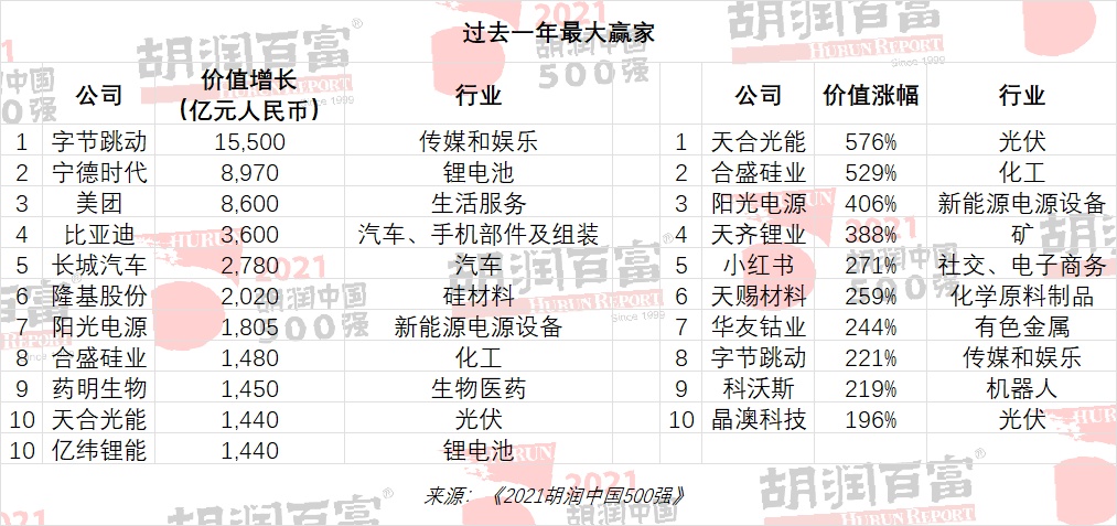 胡润中国500强的总价值比疫情前增长了30万亿,其中以字节跳动、宁德时代和腾讯为首的前十家增长最多的公司一共增长了7.6万亿,占到四分之一。从涨幅比例来看,新冠疫情爆发以来,这两年价值涨幅最大的前十家公司中,有8家从事新能源相关行业,以主营光伏逆变器等新能源电源设备研发的阳光电源为首,还有4家车企:理想、小鹏、比亚迪和长城,新能源汽车电池供应商宁德时代,锂电原材料供应商赣锋锂业,以及主要从事工业硅及有机硅等硅基新材料产品研发的合盛硅业。
