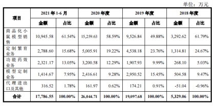 其中,商品化小鼠模型销售业务包括斑点鼠、免疫缺陷小鼠模型、人源化小鼠模型、疾病小鼠模型与基础品系小鼠,为公司主要收入来源。于报告期内分别给公司贡献了3292.62万元、9526.84万元、1.53亿元及1.09亿元的收入,在各期营业收入中占比分别为61.79%、49.88%、58.59%及61.54%。