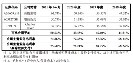 从毛利率来看,主营业务的毛利率(剔除股份支付)分别为68.24%、68.95%、76.21%和75.60%,远高于同业可比公司均值的44.81%、46.40%、49.48%及50.63%。其中,商品化小鼠模型销售毛利率分别为76.73%、79.37%、85.01%和81.03%。