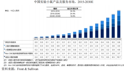 据招股书显示,国外实验动物小鼠模型研究历史较长,动物模型市场发展的也较为成熟。国内动物模型市场还处于发展早期,随着近几年创新药物市场的迅速发展,市场规模呈现高速增长态势。根据Frost&Sullivan数据,中国实验小鼠产品和服务市场规模2019年为28亿元,行业规模较小。其中,集萃药康业务收入规模约为1.9亿元人民币,市场占比为6.7%,居于第二。不过随着生命科学研究和新药开发的蓬勃发展,预计到2024年规模将增长至84亿元,复合年增长率约为24.4%,预计至2030年这一数字将达到236亿元人民币。