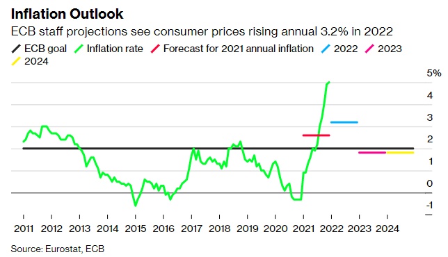欧洲央行当前预测数据显示2022年CPI增幅将达到3.2%,2023年降至1.8%