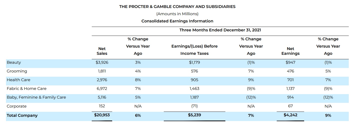 按业务划分,化妆品净销售额为39.26亿美元,同比增长3%;洗漱产品净销售额为18.11亿美元,同比增长4%;健康保健产品净销售额为29.76亿美元,同比增长8%;纺织品及家居护理产品净销售额为69.72亿美元,同比增长7%;婴儿、女性及家庭护理产品净销售额为51.16亿美元,同比增长5%。