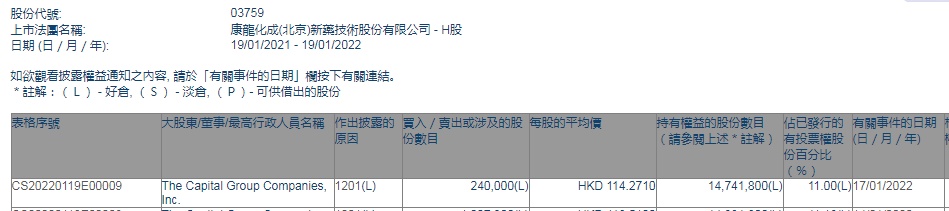 智通财经APP获悉,香港联交所最新资料显示,1月17日,美国资本集团减持康龙化成(03759)24万股,每股作价114.2710港元,总金额约为2742.50万港元。减持后最新持股数目为1474.18万股,最新持股比例为11%。