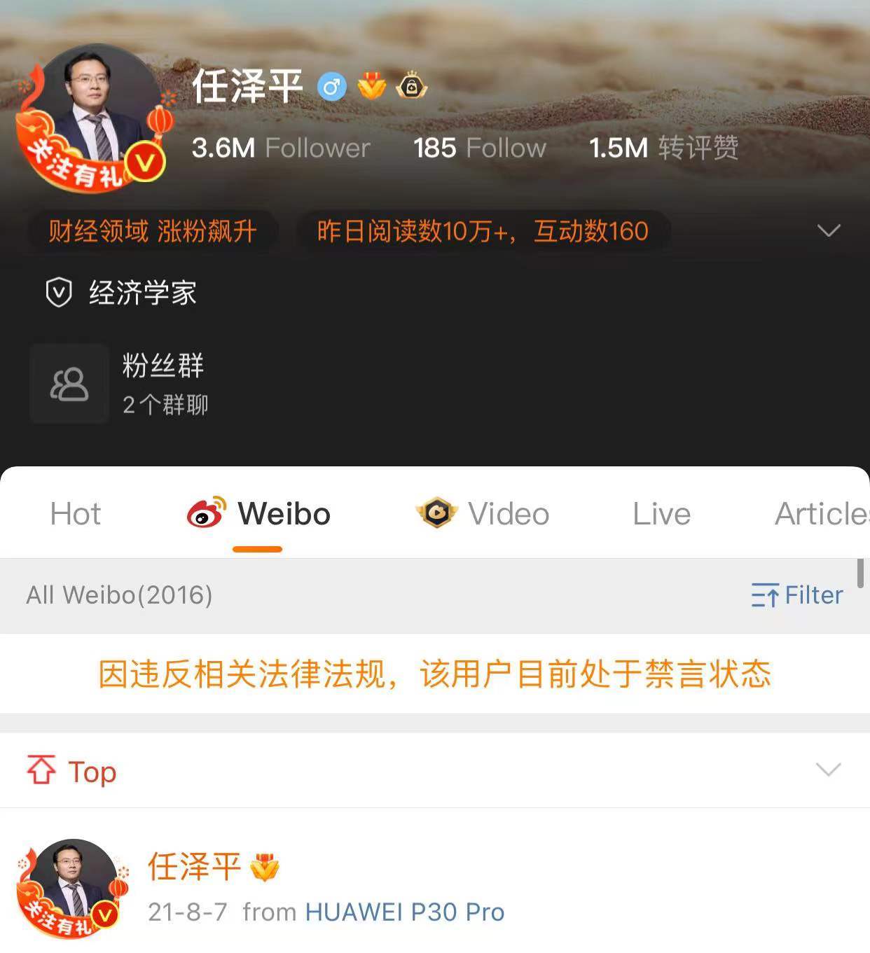 1月12日晚间,任泽平微博显示“因违反相关法律法规,该用户目前处于禁言状态”。任泽平的微信公众号“泽平宏观”1月10日发布的《解决低生育的办法找到了——中国生育报告》以及1月11日发布的《关于“鼓励生育基金”的几点回应》两篇文章已显示为“此内容因违规无法查看”。