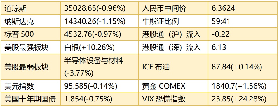 1.隔夜美股截至收盘,道指跌339.82点,跌幅0.96%,报35028.65点;纳指跌166.64点,跌幅1.15%,报14340.26点;标普500指数跌44.35点,跌幅0.97%,报4532.76点。港股ADR指数小幅上涨,按比例计算,收报24133点,升5.66点或0.02%。