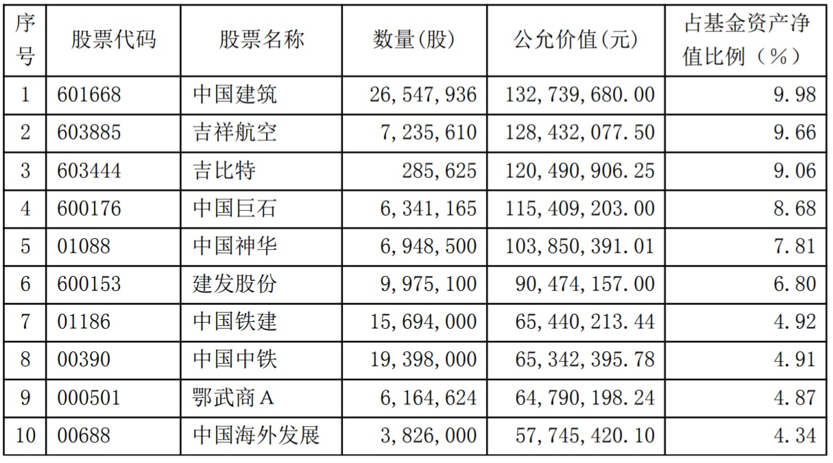 中泰兴诚价值的第四季度前十大股票持仓中,前两大重仓股仍为中国建筑(601668.SH),吉祥航空(603885.SH),占比分别为9.98%及9.66%,较上一季度变化不大;太阳纸业(002078.SZ)退出前十大持仓名单,而中国海外发展(00688)获得入围。
