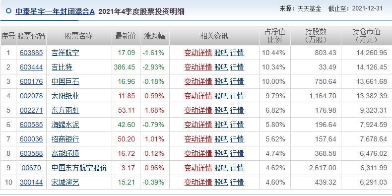 据中泰星宇混合基金持仓数据显示,吉祥航空(603885.SH)于四季度超过吉比特(603444.SH)位于重仓股首位。与中泰开阳混合基金相同,三季度持仓的扬农化工(600486.SH)也于四季度退出了前十重仓股。前十其他持仓股也获得了不同程度的减持,例如:太阳纸业(002078.SZ)、中国巨石(600176.SH)和东方雨虹(002271.SZ)。