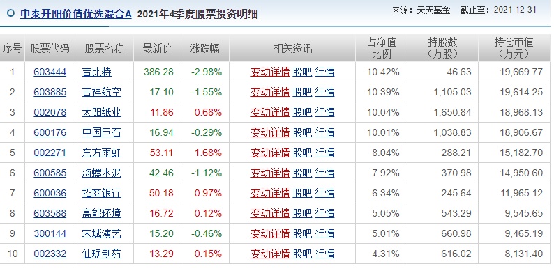 据中泰开阳混合基金持仓数据显示,吉比特(603444.SH)虽遭减持12.76万股,但仍坐稳重仓股第一位。值得注意的是,三季度持仓的扬农化工(600486.SH)、泸州老窖(000568.SZ)于四季度退出了前十重仓股。此外,高能环境(603588.SH)、仙琚制药(002332.SZ)于四季度被加入前十重仓股。