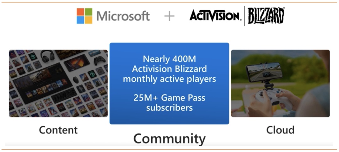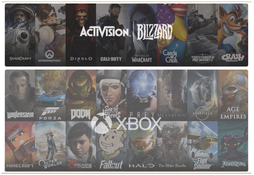 1)收购的表面:收购包括动视暴雪和子公司King的知名IP及作品,如《魔兽》系列、《暗黑破坏神》、《守望先锋》、《使命召唤》等。这是自20年末收购Zenimax工作室后,又一次大幅扩充微软的游戏资产库。通过将暴雪的游戏阵容和月活用户融入XGP(Xbox Game Pass),进一步加速XGP用户和收入的双增长。
