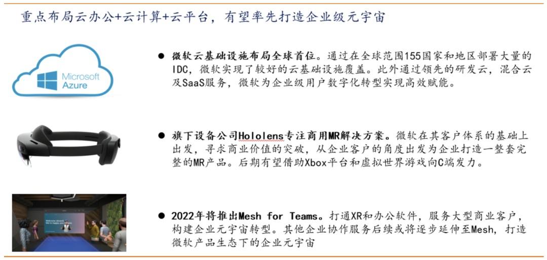 4)为什么要做C端元宇宙?微软此前的重心一直是面向企业,从办公软件到企业级云服务。在元宇宙方面,微软则是通过Azure、Hololens和Mesh for Teams平台构筑企业元宇宙。我们认为,C端市场对微软意味着更多的内容和用户数据,未来具备更强的云计算需求。发展C端市场在拓宽更大市场空间的同时,也赋能/加速其云、AI、生产力平台的发展。