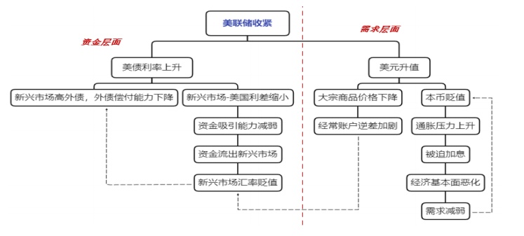 需求:美元升值拖累大宗商品价格,依赖资源品出口的新兴经济体经常账户恶化,同时其被迫跟随美国加息,加大其需求下行压力。