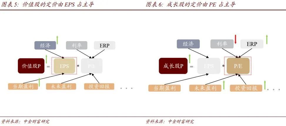 价值股的定价来自其稳健的EPS;成长股则由PE占主导(对未来爆发式的增长率g的预期)。