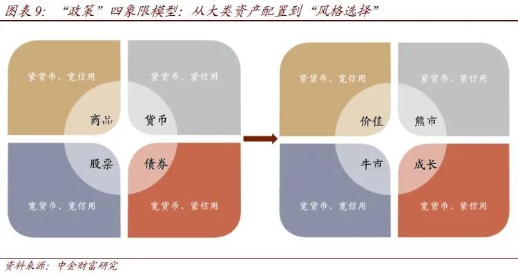 例如,政策的松紧程度用“信用”、“货币”两个因子替代,可得“政策”四象限风格选择模型:
