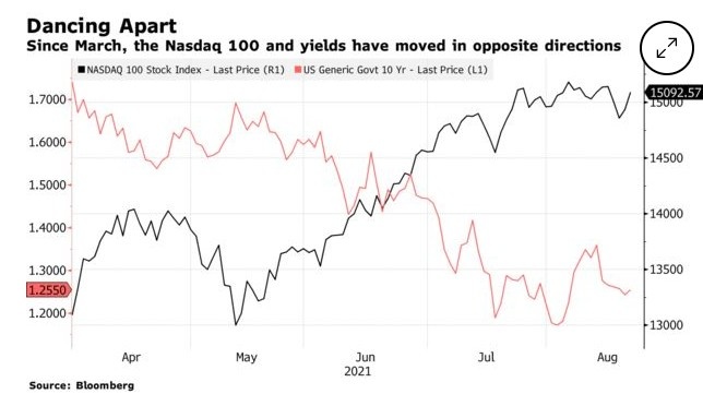 因此,自去年3月底一直到8月中下旬,10年期美国国债收益率下跌了近0.5个百分点。纳斯达克综合指数也因此应声而涨,纳指从3月中下旬开始反弹,中间的回调并不妨碍其在8月29日创下了当时的新高。在此期间,纳斯达克100指数上涨了17%,比标准普尔500指数高出4个百分点以上。纳斯达克100指数和标准普尔500指数当周均创下历史新高。除亚马逊(AMZN.US)公司外,FAAMG的其余成员股票的涨幅较大,谷歌(GOOG.US)上涨了37%,微软(MSFT.US)上涨了28%,苹果(AAPL.US)和Meta Platforms(FB.US)的涨幅均超过了20%。