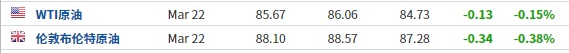 3.截至发稿,WTI原油跌0.15%,报85.67美元/桶。布伦特原油跌0.38%,报88.10美元/桶。