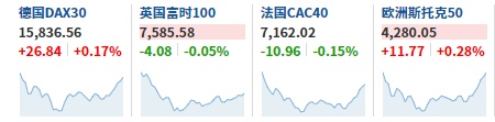 2.截至发稿,德国DAX指数涨0.17%,英国富时100指数跌0.05%,法国CAC40指数跌0.15%,欧洲斯托克50指数涨0.28%。