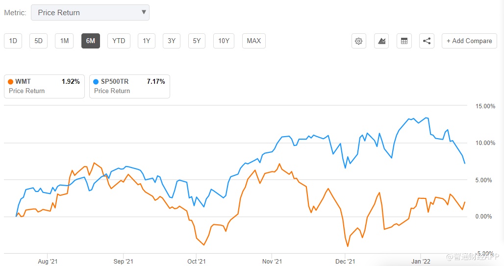 截至发稿,沃尔玛盘前跌0.59%,报143.09美元。该股在过去六个月中一直落后于标普 500 指数。