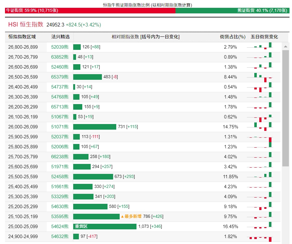 法兴恒指牛熊证街货分布图中的数据显示,熊证街货重货区在25000-25099区间,该区间最新熊证数量为1073张,较上一交易日增加346张;最多新增在25100-25199区间,该区间最新熊证数量为786张,较上一交易日增加426张。